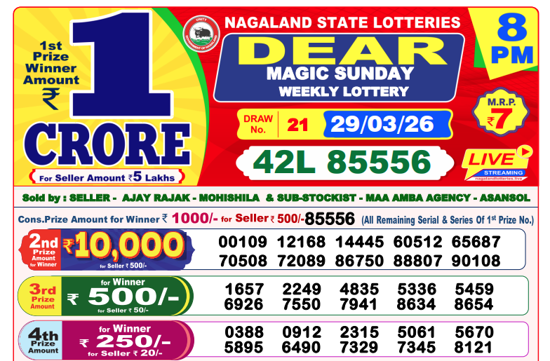 Nagaland, March 29, 2026: The results of the Dear Magic Sunday Weekly Lottery, conducted by Nagaland State Lotteries, have been officially announced. The draw was held at 8 PM, featuring a bumper first prize of 1 crore.